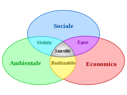 Un’immagine che rende bene il concetto originario e globale di ‘sostenibilità’ – ma che nella sua evidenza mostra subito quanto sia ambiguo e perfino mistificatorio cercare di applicarla all’attuale modello di sviluppo – è sintetizzata dall’intersezione grafica dei tre ‘campi’ d’intervento (sociale, ambientale ed economico):