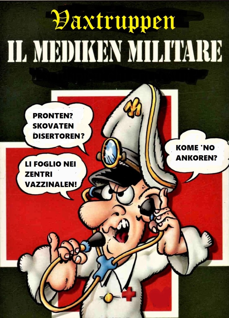 Ma è nella cronaca di Napoli che il quotidiano raggiunge il vertice della retorica bellica. L’articolo di Ettore Mautone sulla “lotta al Covid” già nel titolo lancia addirittura un appello a “Stanare i disertori”. Si riferisce che anche la Regione Campania sta pianificando una vera e propria strategia “per reclutare i dispersi […] Azioni da mettere in campo…per reclutare chi non si è ancora vaccinato tra gli over 60”. [vi] L’approccio militarista agli interventi di contrasto alla pandemia da Covid-19, dunque, non solo continua ma si consolida. L’insoddifazione delle autorità governative e regionali per non aver conseguito del tutto gli obiettivi che si erano prefissati, infatti, sembra sfogarsi in modo stizzoso quanto autoritario su coloro che non hanno obbedito disciplinatamente alle loro direttive. Ecco, allora, che nel miglior caso vengono qualificati come ‘dispersi’, mentre in quello di rifiuto palese come ‘renitenti’ e perfino ‘disertori’. Questi ‘fuggiaschi’ andrebbero a tutti i costi ‘convinti’, ‘reclutati’ e, se necessario, ‘stanati’ da dove si nascondono, facendosi forti dell’art. 32 della Costituzione, in base al quale: “Nessuno può essere obbligato a un determinato trattamento sanitario se non per disposizione di legge. La legge non può in nessun caso violare i limiti imposti dal rispetto della persona umana”. Ma, a quanto pare, nulla sembra fermare le ‘VaxTruppen’ del generale Figliuolo. A meno che il buon senso, le elementari norme di democrazia ed il rispetto delle persone non abbiano la meglio sulla loro ridicola arroganza e sul vergognoso atteggiamento subalterno dei media.